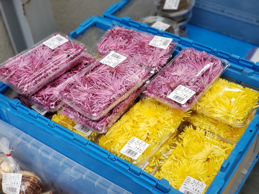 そんな「ショクヨウギク」が色鮮やかなパック詰めにされて販売されていました。東京のスーパーでは、なかなか見かけない光景です。