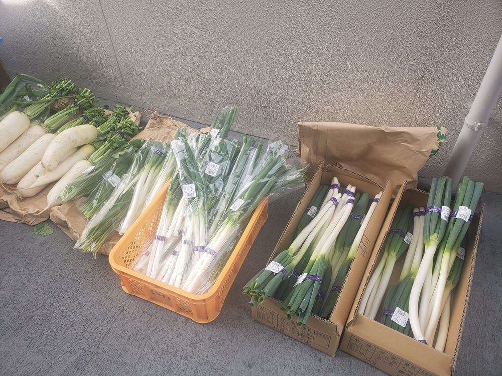 入場すると、まず目につくのが大根やねぎなど、定番の野菜です。大根は、長さや太さがさまざまなものから選びます。