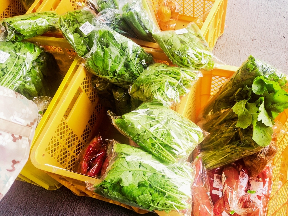 葉もの野菜は、どれも新鮮。コンテナからあふれるほど、たくさん売り場に並んでいます。