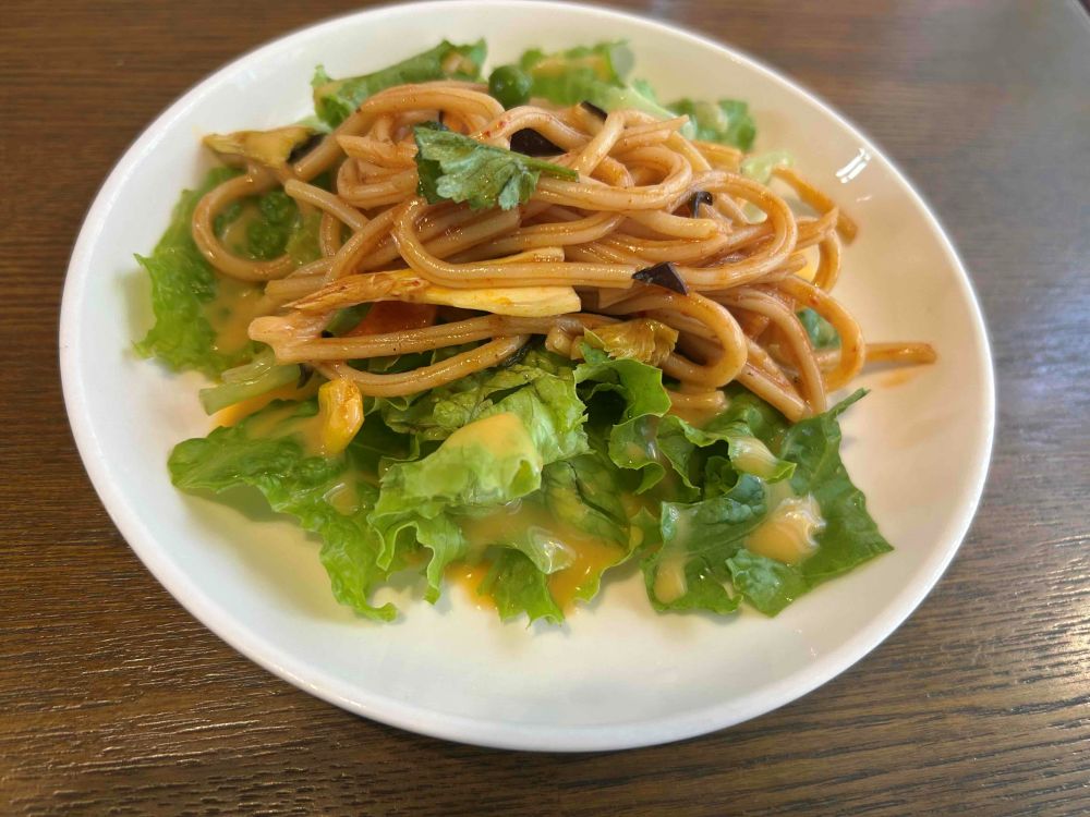 最初に運ばれてきたのは、こちらのサラダ。前菜のサラダにも麺が付いていて、ボリューム満点です。