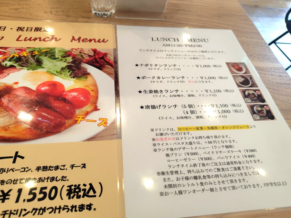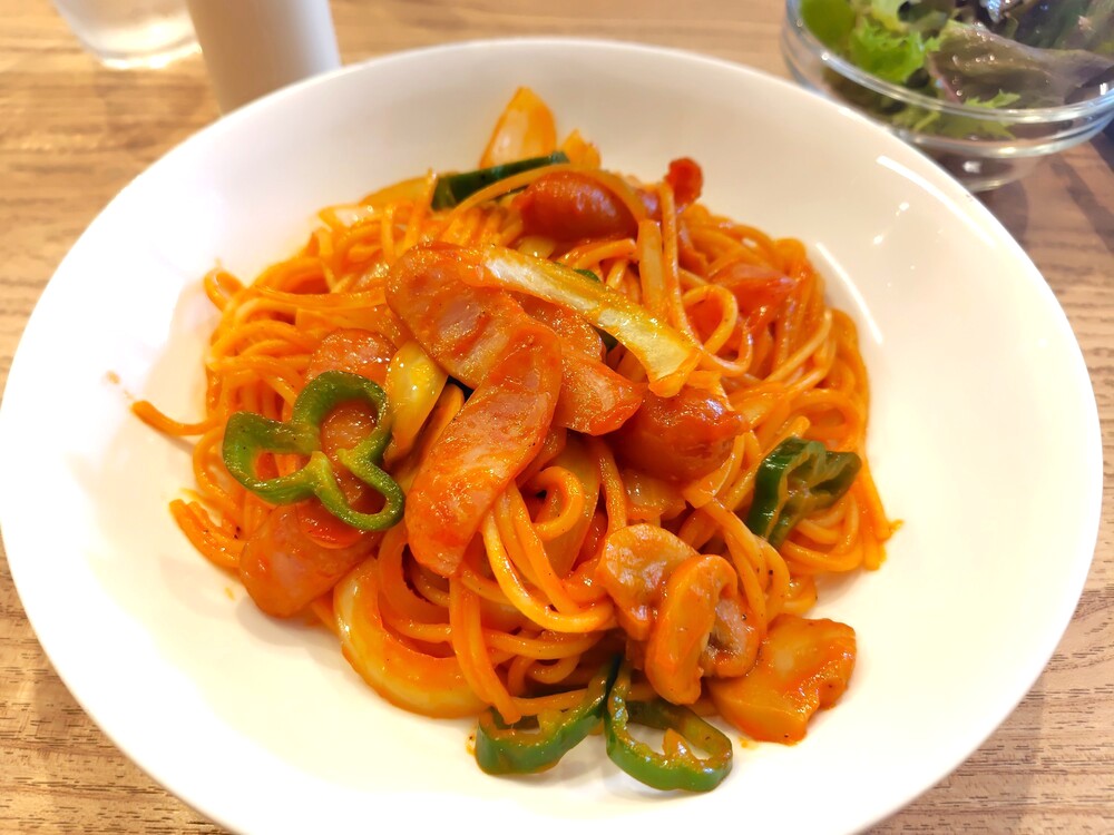 ランチタイムのメニューで気になったのは、こちらのナポリタンです。具材は定番のウインナー・玉ねぎ、ピーマン・マッシュルーム。あざやかなケチャップの赤色が食欲を刺激します。