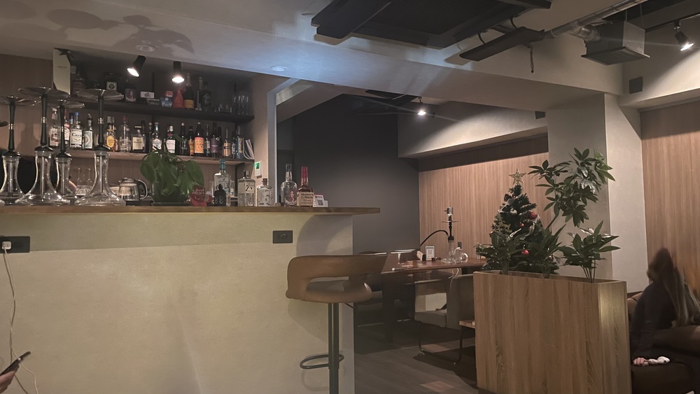 木目を基調とした内装に、やわらかな照明が合わさって、第一印象から「ここ好きかも」と感じます。 カウンターにはお酒やシーシャが並び、ほどよく生活感があって緊張しません。