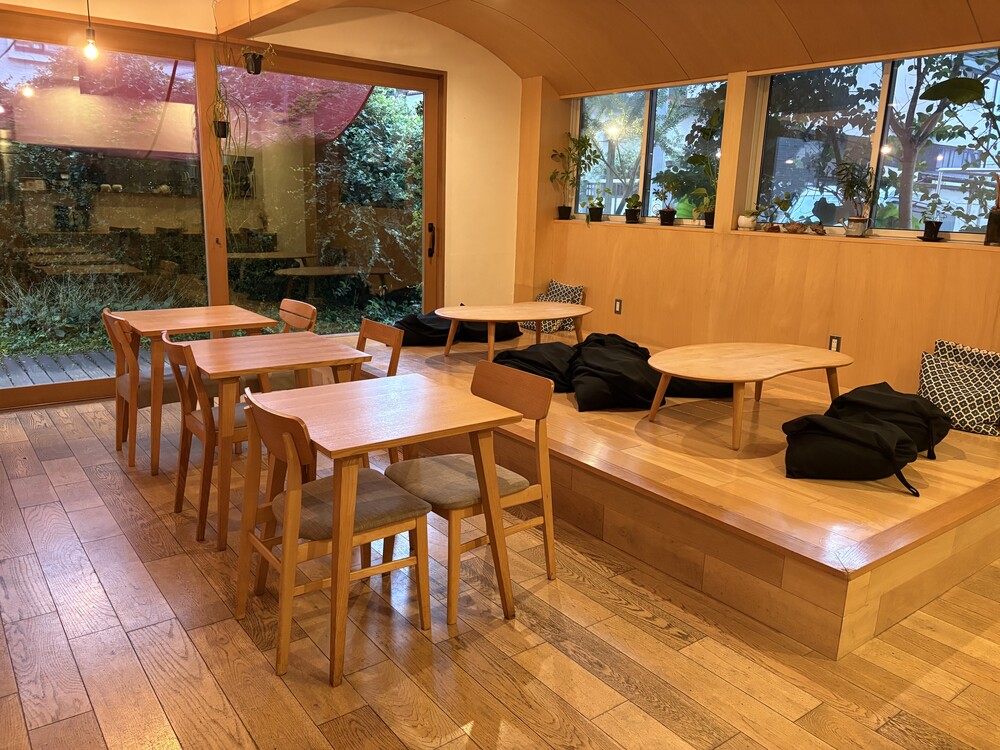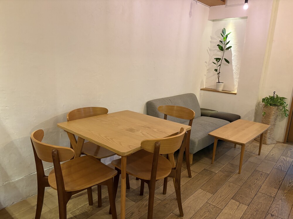 2人掛けのテーブル3卓、板張りの小上がり席テーブル2卓(1卓4人席)、2人掛けのソファ席1卓、4人掛けのテーブル1卓、カウンター席4席があります。