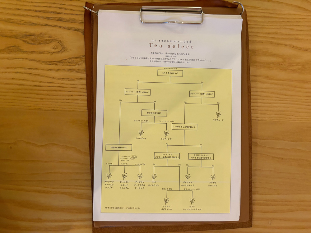 たくさんの種類の紅茶があって、どれを選べばいいか迷ってしまう時は、メニューの一番前に記載されてる「Tea select表」を使って見てください。