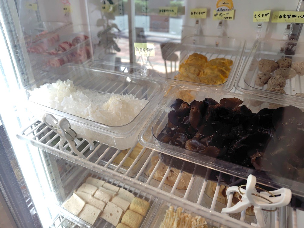 みずみずしい国産の野菜に、麻辣湯には欠かせない本格的な中華具材が並びます。白きくらげや鴨血(アヒルの血を固めた豆腐のような食材)など、専門店ならではの具材にワクワクがとまりません!