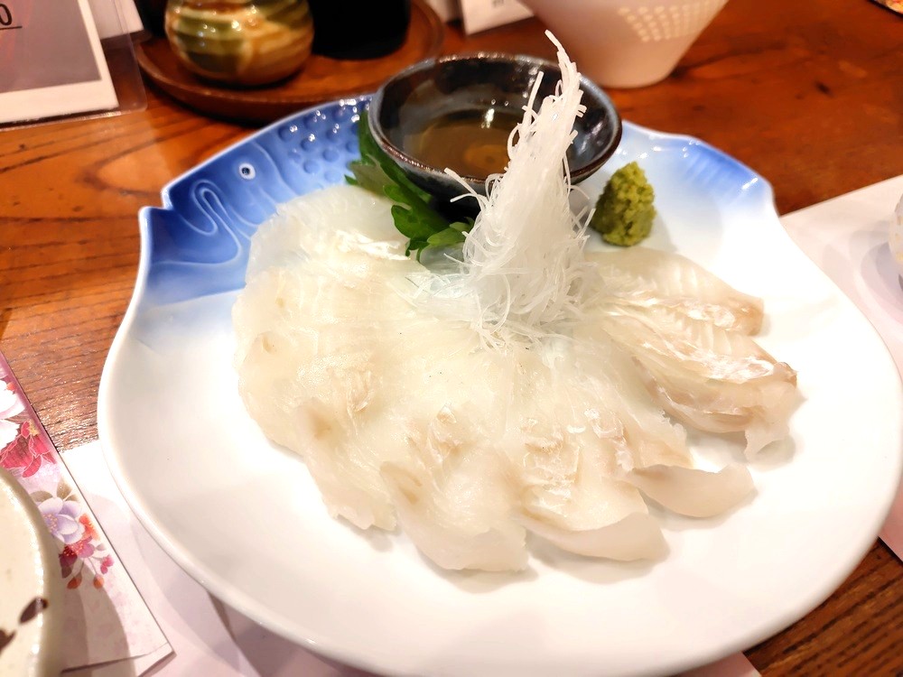 こちらは限定メニューのヒラメ。日本酒に梅干しなどを入れて煮詰めた煎り酒につけていただきます。これは日本酒に合わないわけがありません。