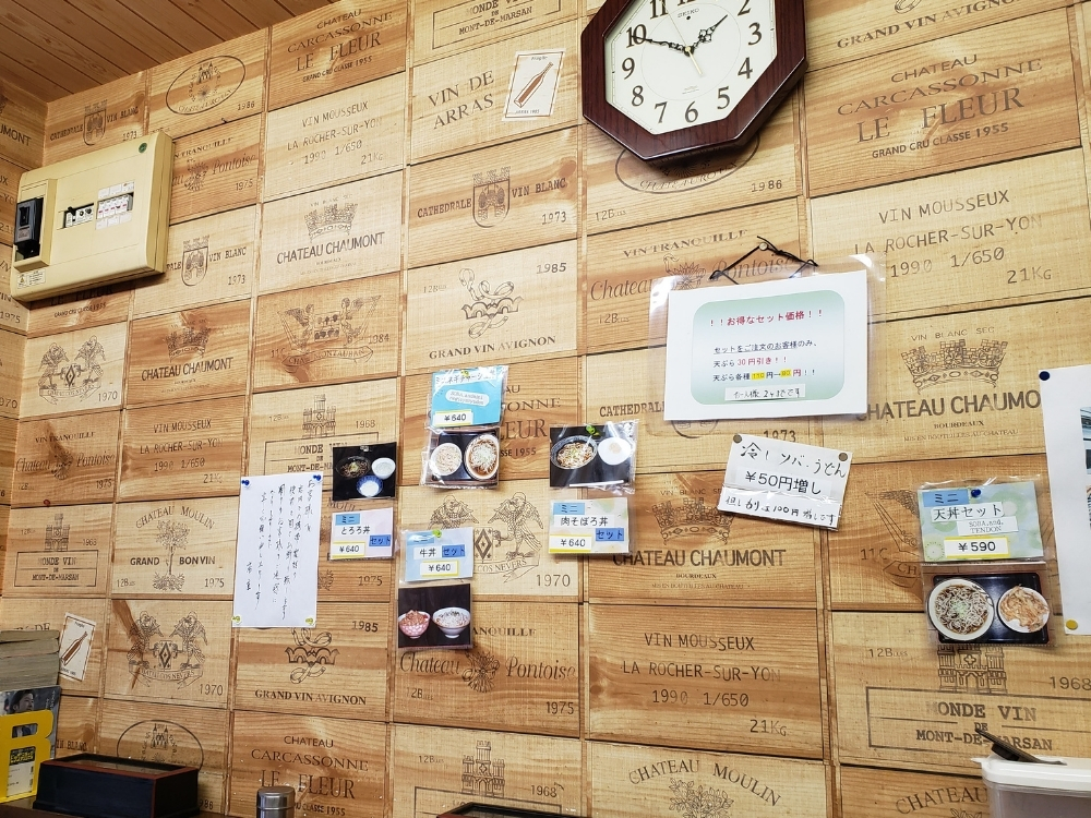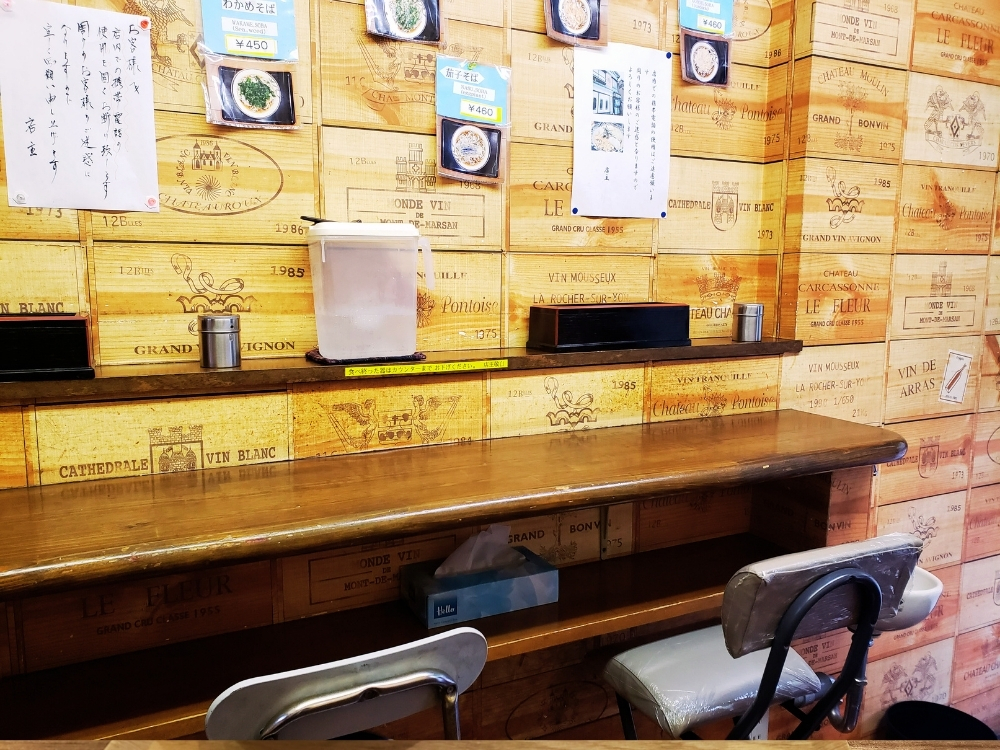 街道めん工房の店内に一歩足を踏み入れると、壁面いっぱいのワインの木箱を使った内装に驚かされます。