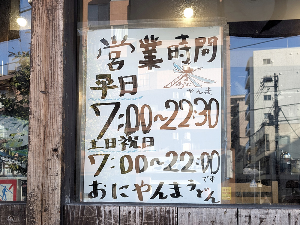 写真のとおり、長い営業時間も特徴のおにやんま。朝の出勤前や、少し帰りが遅くなったときも、とても便利です。また、お店は終日通し営業のため、時間を問わず好きなときに本場の讃岐うどんを楽しむことができます。