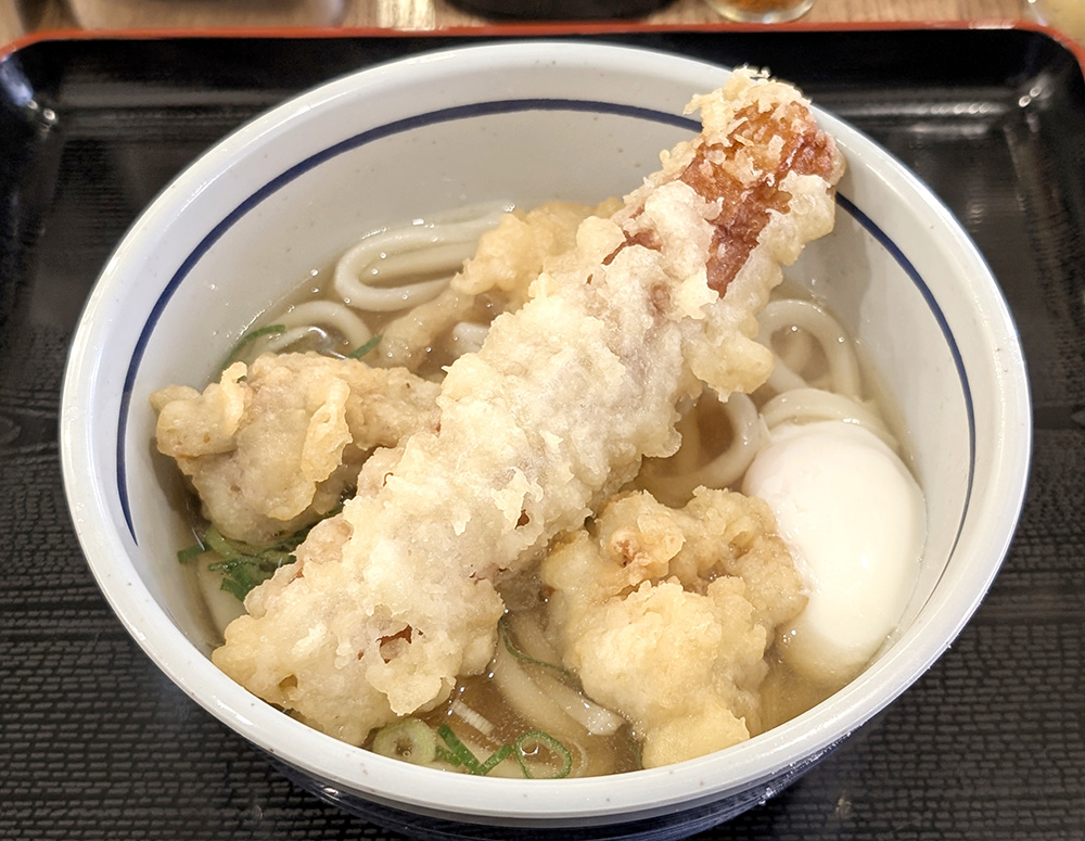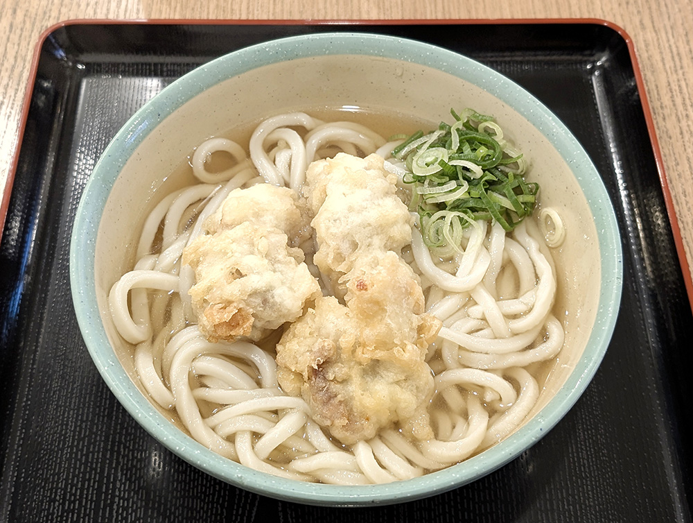 同じく看板メニューの「とり天ちくわ天うどん」。大きなちくわ天のほか、とり天が3つとかぼちゃの天ぷらが入っています。