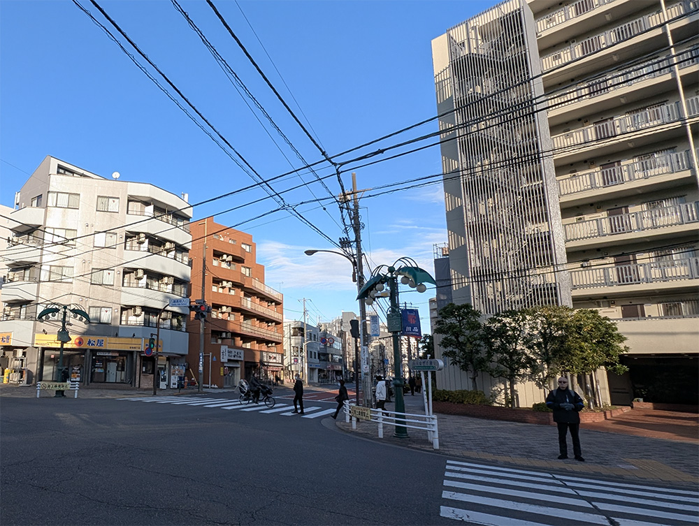 駅からまっすぐ右に進み、2つ目の信号がある「八潮高校前」交差点の横断歩道を渡ります。
