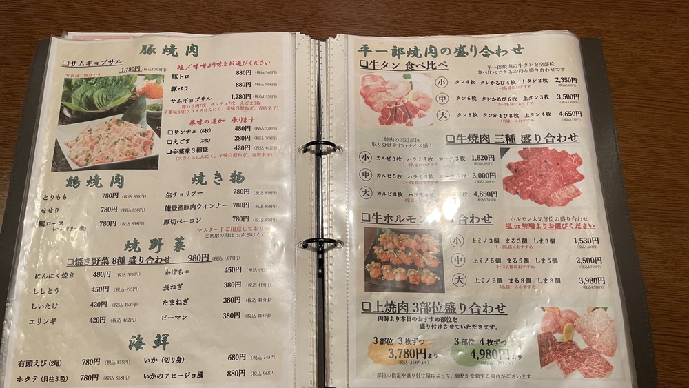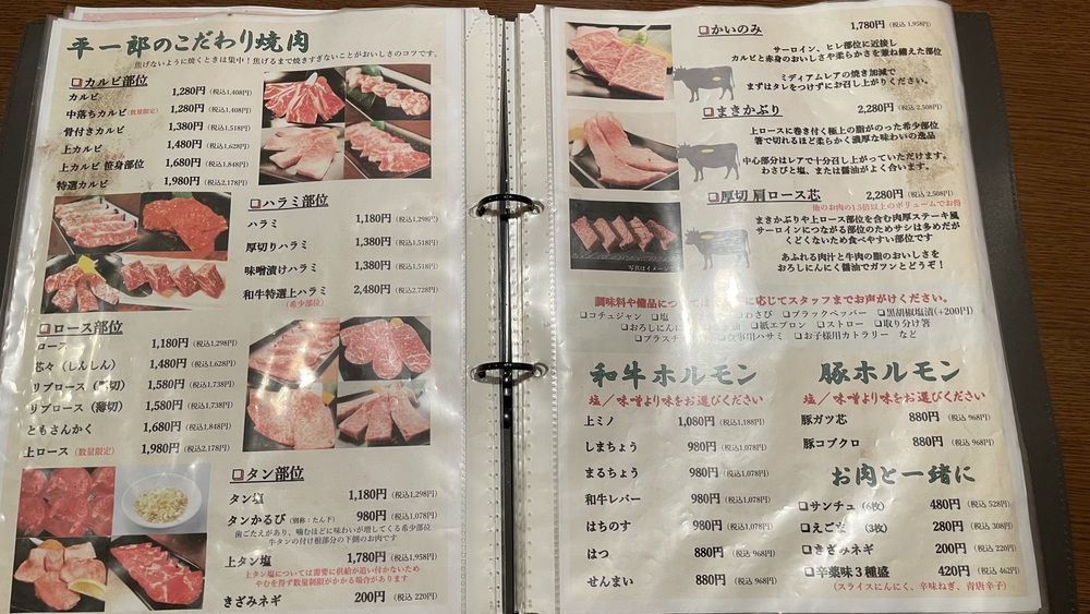 ロースやカルビ、タンにホルモン、さらには希少部位まで、ページいっぱいに並ぶお肉の名前。お肉だけでなくサイドメニューやドリンクメニューも豊富でした。