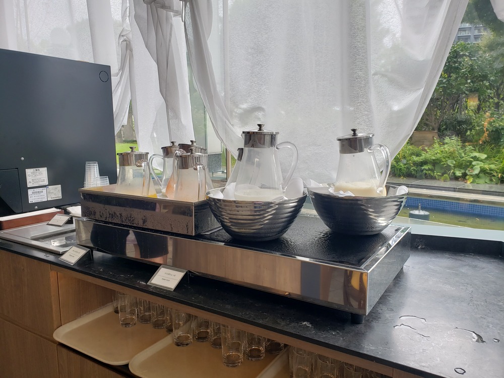 ドリンクバーにはコーヒーマシン、ドリンクマシンに加え、おかわり自由のフリーズドライスープ、フレッシュジュースも並んでいます。アップル、グレープフルーツなど、提供されるドリンクが入れ替わるのもうれしいポイントです。