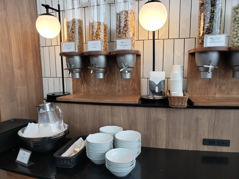 シリアルコーナーには、見て楽しい、色や形がさまざまなシリアルがサーバーに入っています。朝には宿泊者向けの朝食で出された牛乳をしばらく置いてくれているので、ラウンジだけの利用者もおいしい朝食をいただけます。