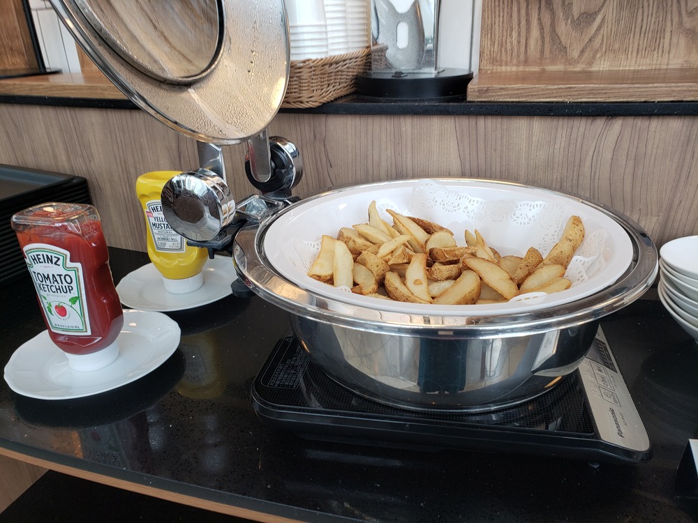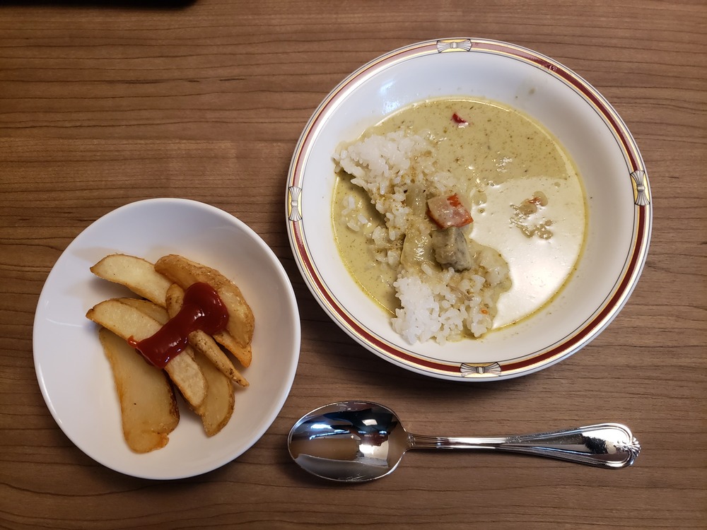 昼食は平日カレービュッフェ。カレーとポテトフライをいただきました。好きなだけおかわりできて大満足です。