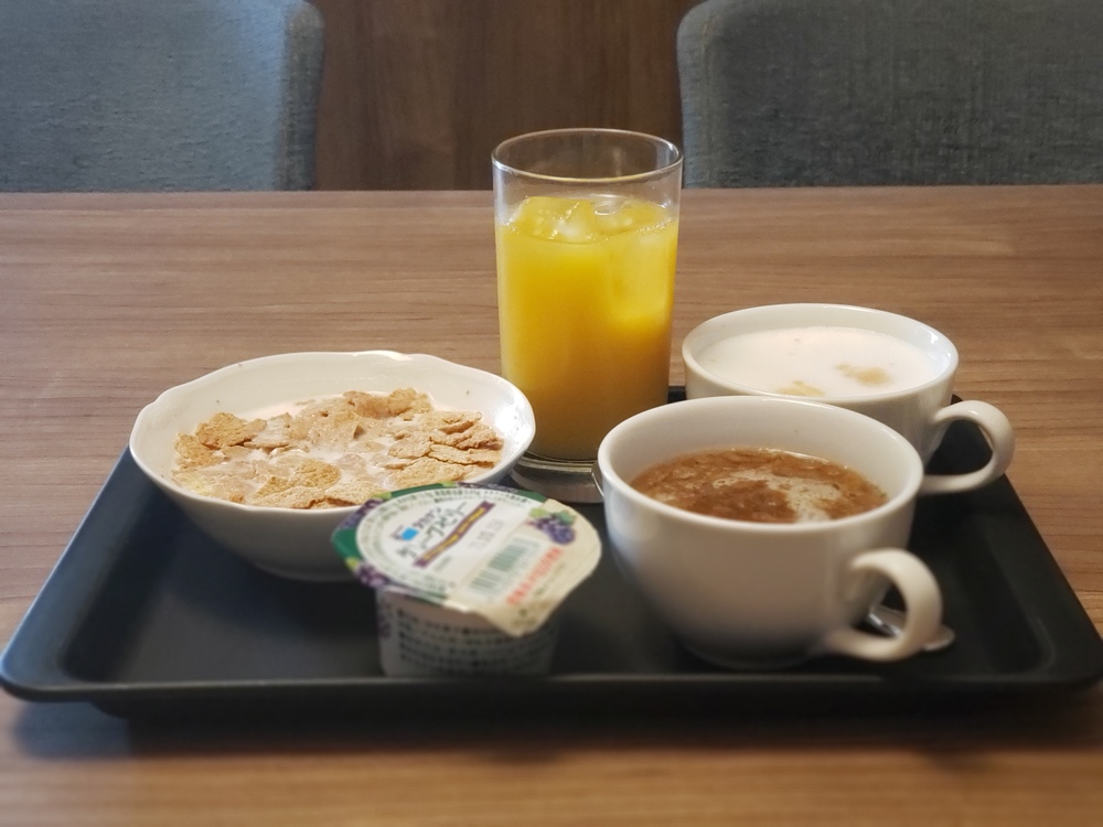 まずは朝食から。シリアルに牛乳をかけたヘルシーな朝食。冷蔵ケースからゼリーもいただきました。スープもコーヒーもそろって十分なボリュームです。