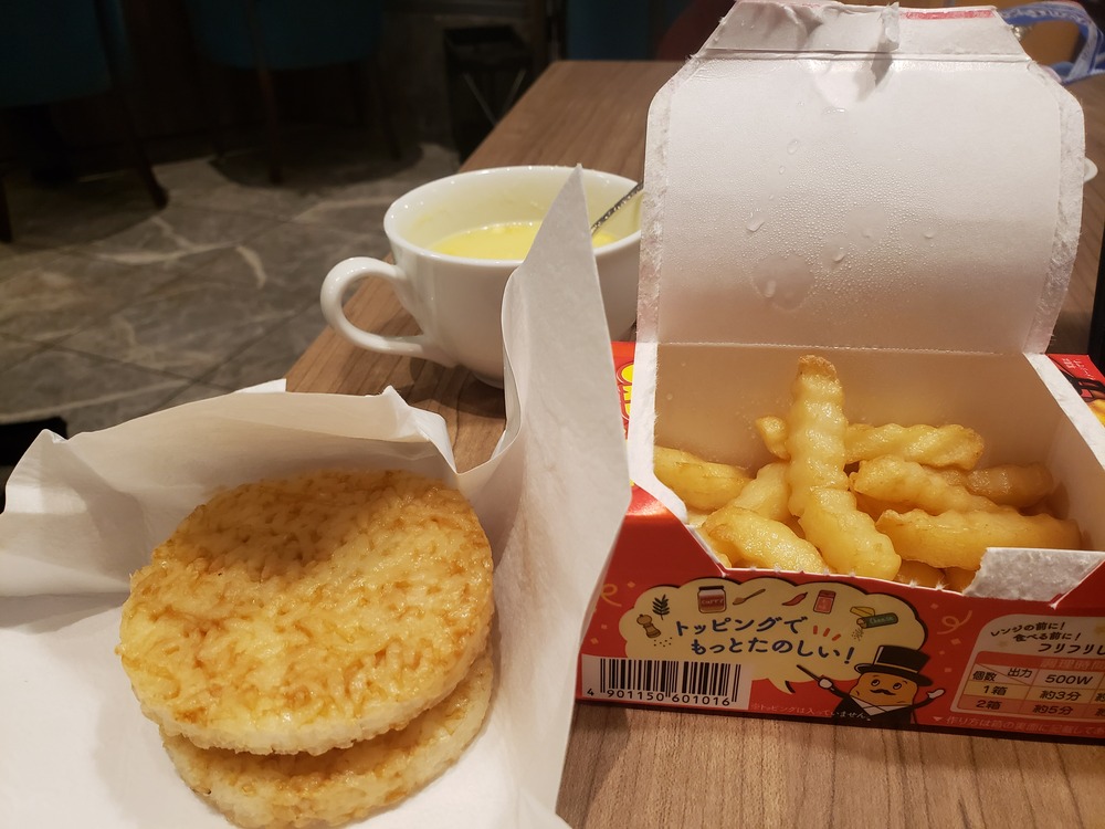 夕食は冷凍食品とスープをチョイス。ライスバーガーとフライドポテトが定番メニューのようです。