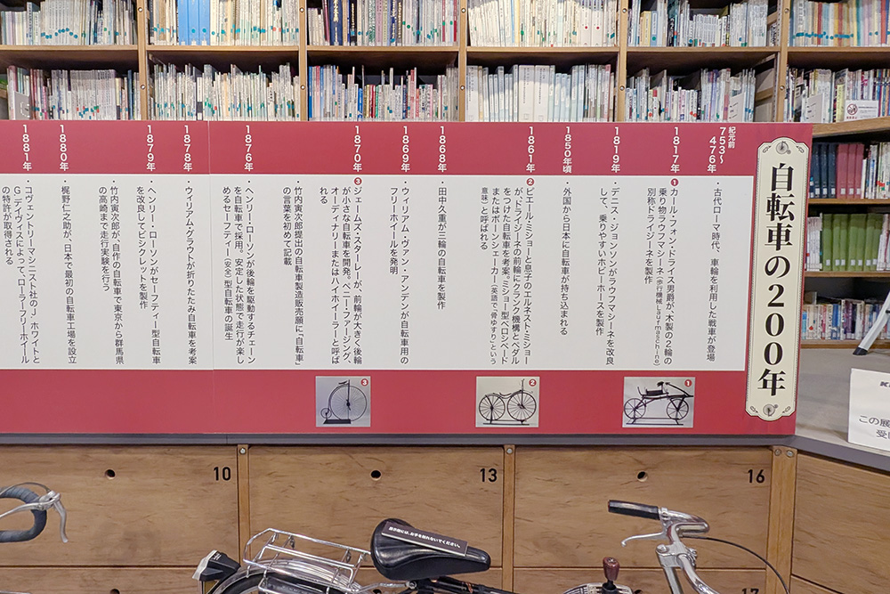 会場には、登場間もない頃の貴重な自転車から最近の自転車まで10台が展示されています。年表やパネルでわかりやすく紹介されており、自転車が好きな方はもちろん、多くのみなさんに自転車について知ってもらえる内容になっています。