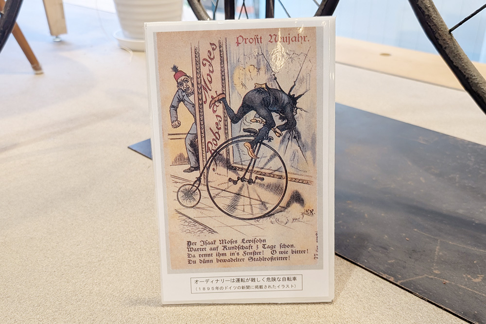 1895年にドイツの新聞に掲載された絵。「オーディナリーは運転が難しく危険な自転車」と書かれています。