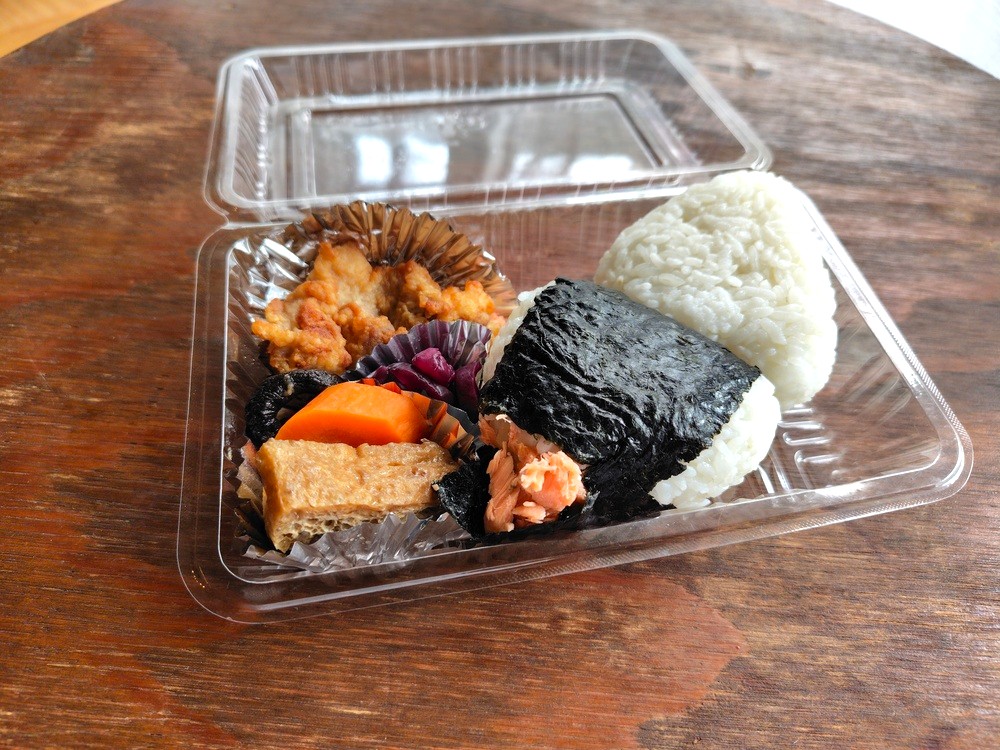 注文したのは好きなおにぎり2種が選べるおにぎり弁当。悩んだ末におにぎりの具は鮭と旨塩にしました。