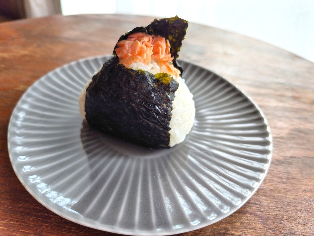 おにぎりのてっぺんに鮭がのっているので、一口目から鮭のあまじょっぱさを感じます。次にお米のうま味が口いっぱいに広がり、たまりません。