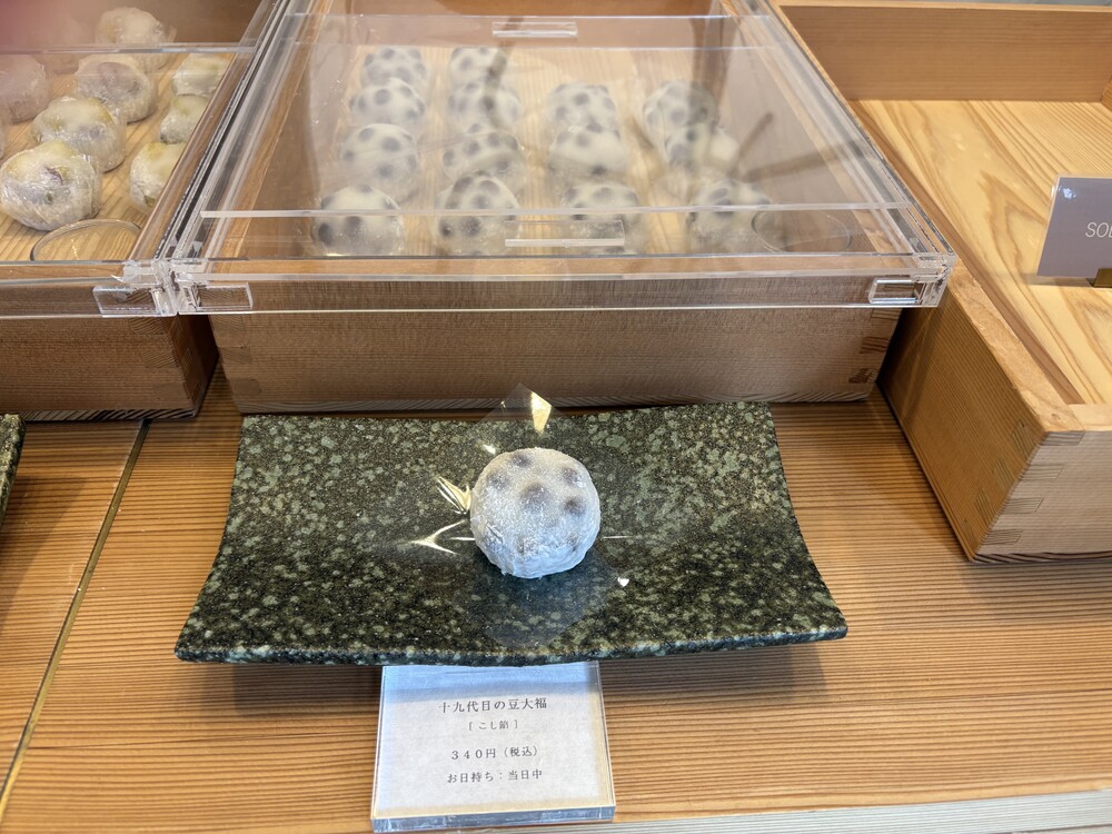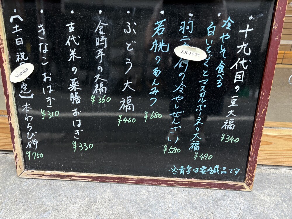 今回写真入りでご紹介した和菓子以外にも、羽二重餅の冷やしぜんざい(税込580円・要冷蔵)・若桃のあんみつ(税込680円・要冷蔵)・ぶどう大福(税込460円)・金時芋の大福(税込360円)・きなこおはぎ(税込310円)・本わらび餅(税込750円)があります。