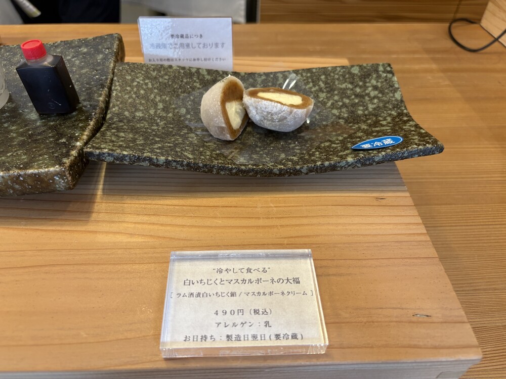 私が取材した日は、”冷やして食べる”白いちじくとマスカルポーネの大福(ラム酒漬白いちじく餡/マスカルポーネクリーム)490円(税込※要冷蔵)が、季節のフルーツとして販売されていました。