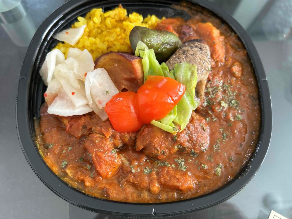 野菜の販売にも力を入れているだけあって、カレーの上には色とりどりの野菜がトッピングされています。チキンもごろごろ入っていて、食べ応え十分の一品でした。